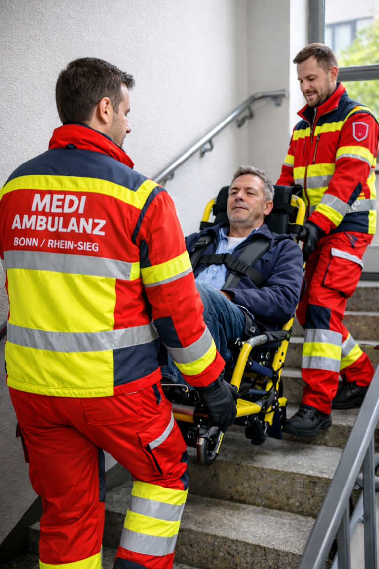 Mit der MEDI Ambulanz Bonn / Rhein-Sieg kein Problem. Gerne transportieren wir Sie sicher und komfortabel in unseren modernen, TÜV geprüften Tragestühlen. Hierbei werden Sie von 2 fachlich geschulten Mitarbeitern begleitet, welche Sie bequem und komfortabel aus dem jeweiligen Obergeschoss über das Treppenhaus hinunter oder auch herauf tragen.